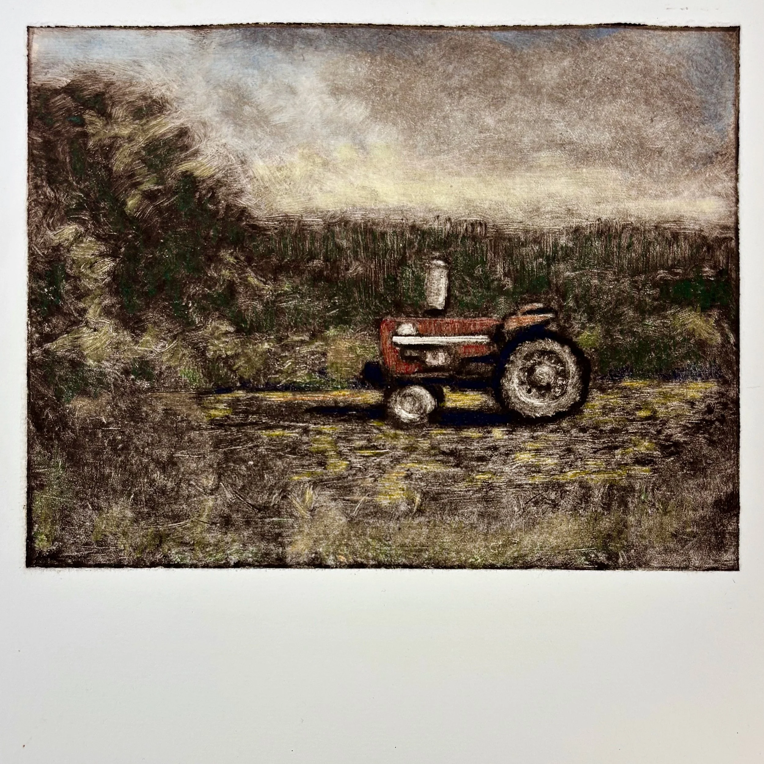 "Balsam Farms Tractor,” 2025. Monotype print, watercolor and colored wax pencil on paper. 10.0 x 8.0 inches, unframed.